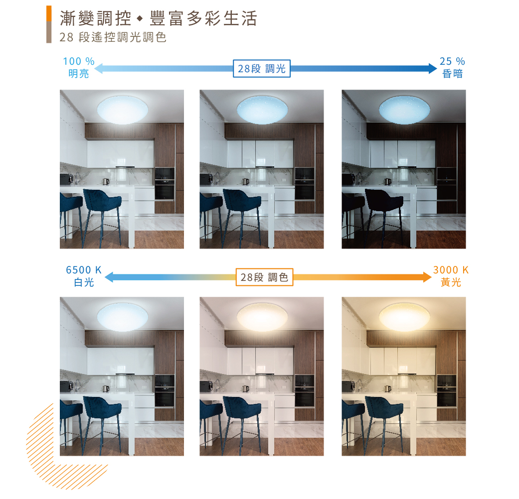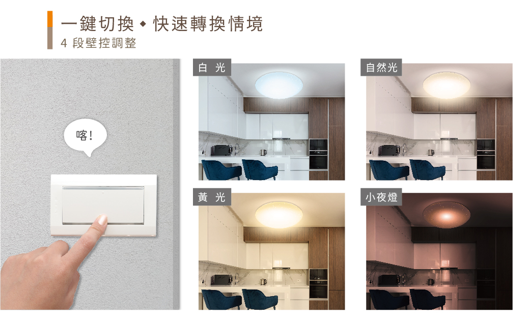 四段壁切調色:白光→黃光→自然光→小夜燈