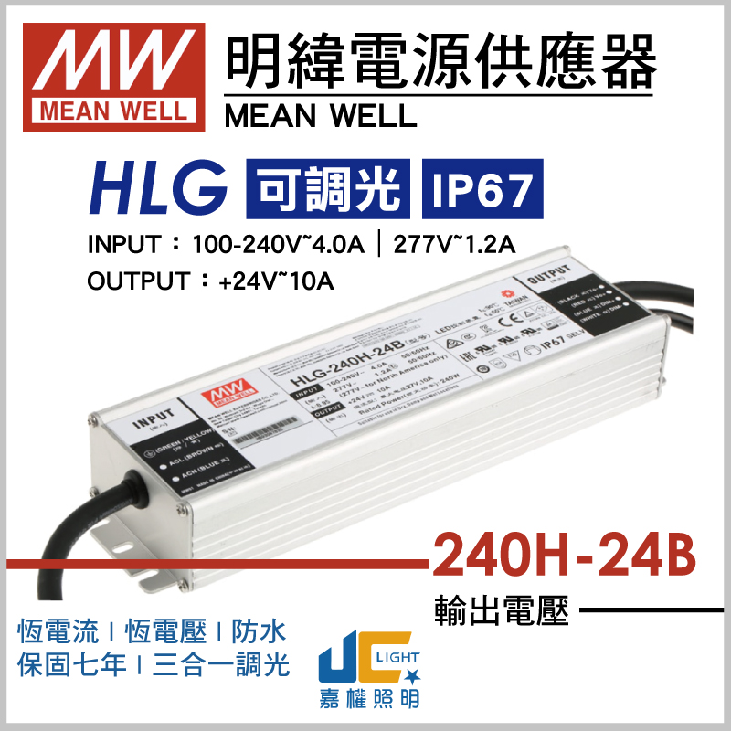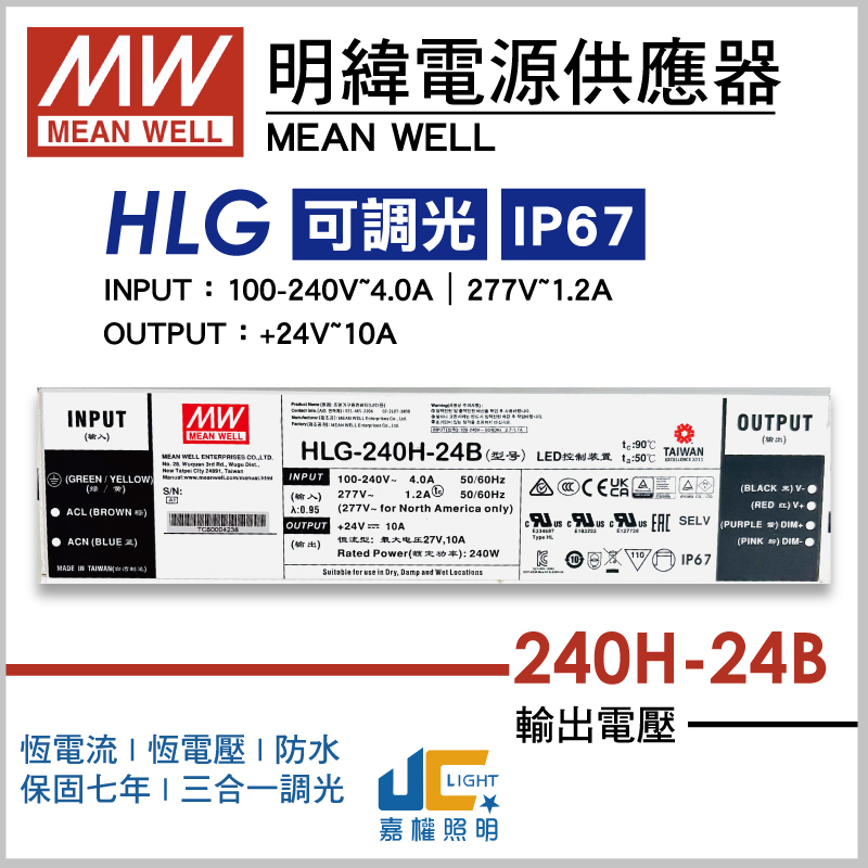 #240W HLG-240H-24B 產品型號 : DC-24V240W-B-HLG 消耗功率 : 240W 輸入電壓 : 90-305V 輸出電壓 : DC24V,10A 尺 寸/mm : 244.2*68*38.8mm 適 用 : LED燈帶、街道、高架、停車場、溫室等照明設備 產品特性 : 恆流恆壓輸出、保固七年、可用三合一調光(0-10Vdc,10VPWM信號和電阻)防水係數IP67