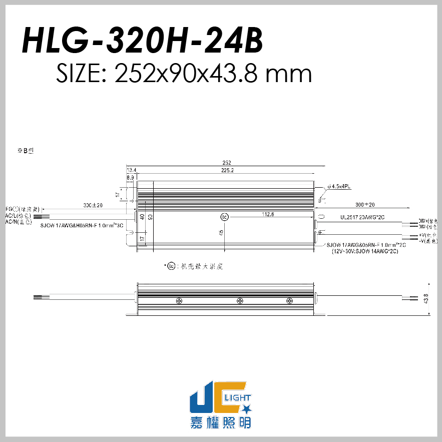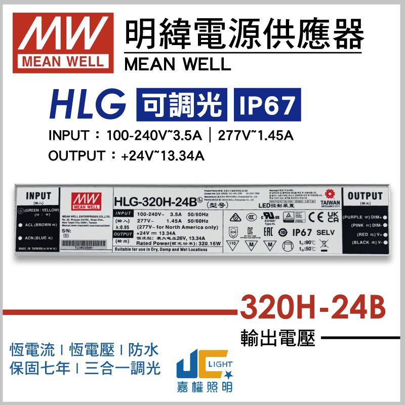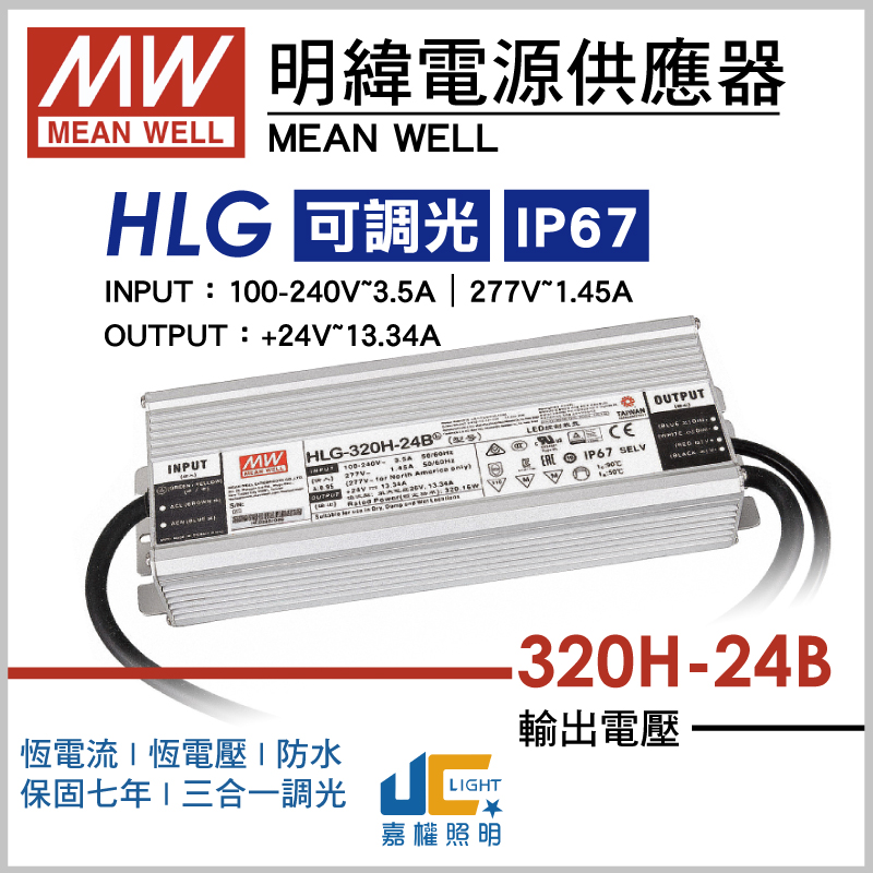 #320W HLG-320H-24B 產品型號 : DC-24V320W-B-HLG 消耗功率 : 320W 輸入電壓 : 90-305V 輸出電壓 : DC24V,13.34A 尺 寸/mm : 252*90*43.8mm 適 用 : LED燈帶、街道、高架、停車場、溫室等照明設備 產品特性 : 恆流恆壓輸出、保固七年、可用三合一調光(0-10Vdc,10VPWM信號和電阻)防水係數IP67
