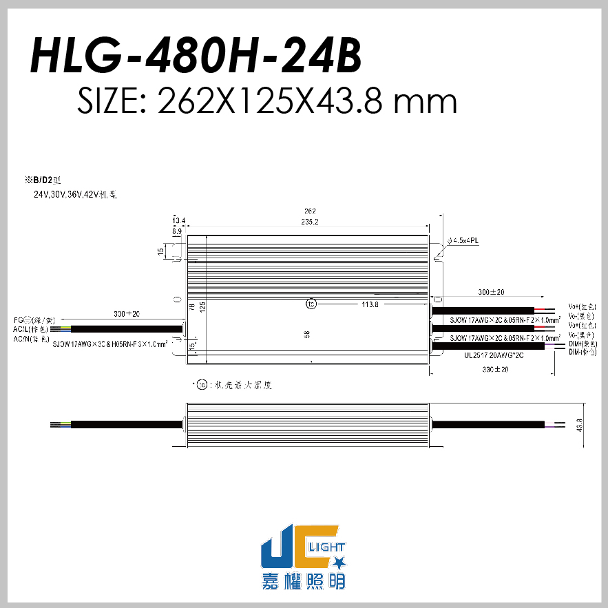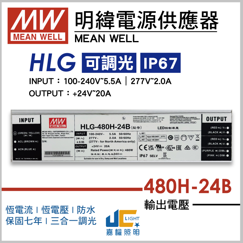 #480W HLG-480H-24B 產品型號 : DC-24V480W-B-HLG 消耗功率 : 480W 輸入電壓 : 90-305V 輸出電壓 : DC24V,20A 尺 寸/mm : 262*125*43.8mm 適 用 : LED燈帶、街道、高架、停車場、溫室等照明設備 產品特性 : 恆流恆壓輸出、保固七年、可用三合一調光(0-10Vdc,10VPWM信號和電阻)防水係數IP67